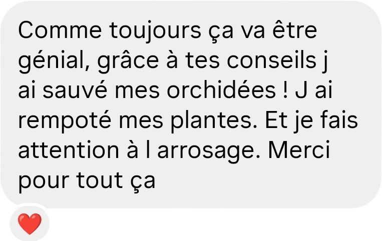 Mon diagnostic SOS Dr. Plantes change tout : on va analyser, ensemble, ton orchidée, ta situation, ton espace, et je vais te donner un plan d’action individualisé. Pas de recette universelle, mais des solutions qui marchent pour ton cas à toi, avec des actions concrètes et adaptées, pour qu'elles repartent et refleurissent, et que tu prennes enfin confiance dans ta main verte.